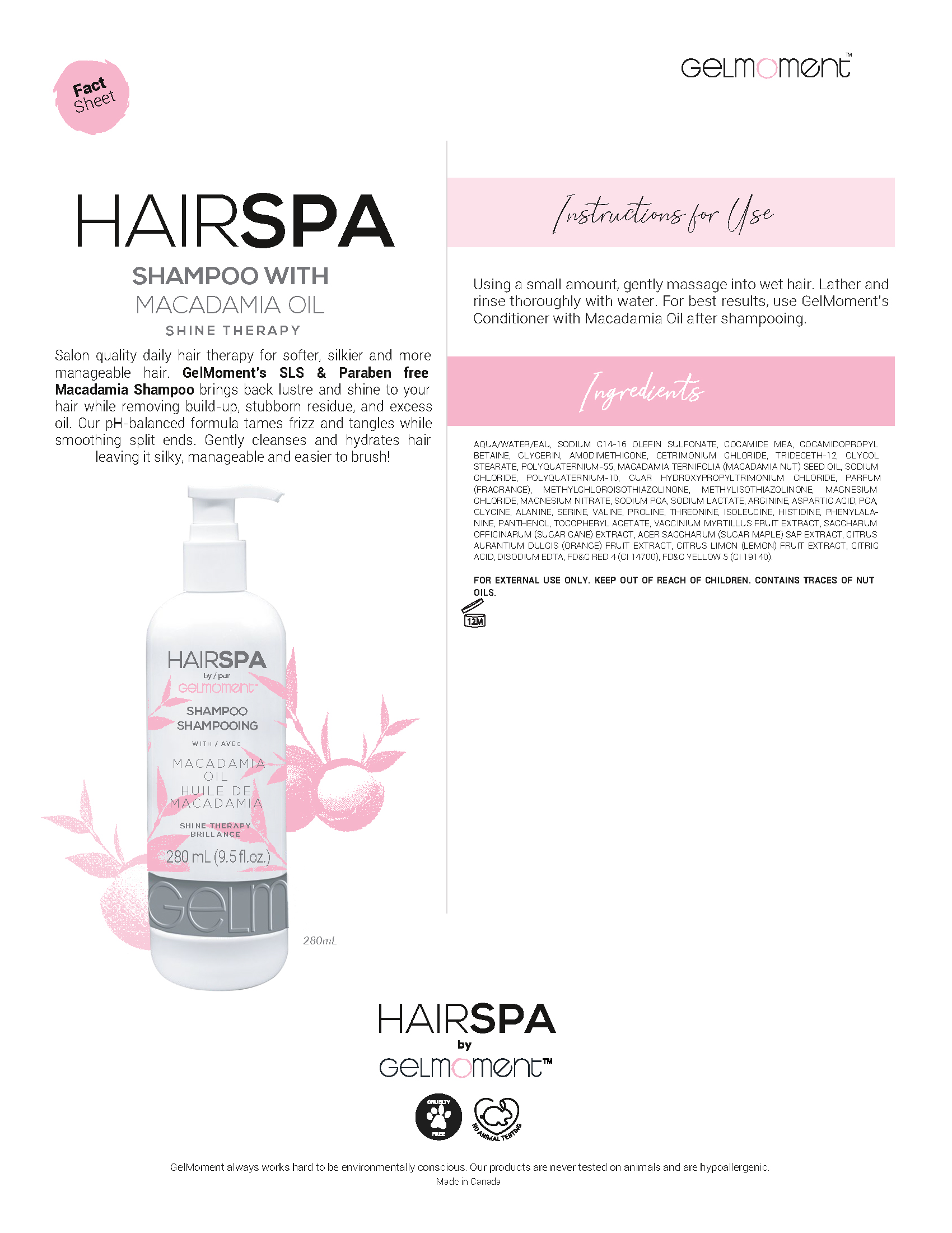 Salon quality daily hair therapy for softer, silkier and more manageable hair. GelMoment’s SLS & Paraben free Macadamia Shampoo brings back lustre and shine to your hair while removing build-up, stubborn residue, and excess oil. Our pH-balanced formula tames frizz and tangles while smoothing split ends. Gently cleanses and hydrates hair leaving it silky, manageable and easier to brush!